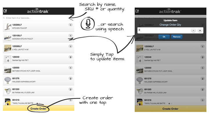 ActionTrak orderMOBILE ordering solution is a simple, app or browser interface for creating and sending orders remotely to ActionTRAK for your internal use as a Purchase Order, as well as directly to your Vendor as a Sales Order.